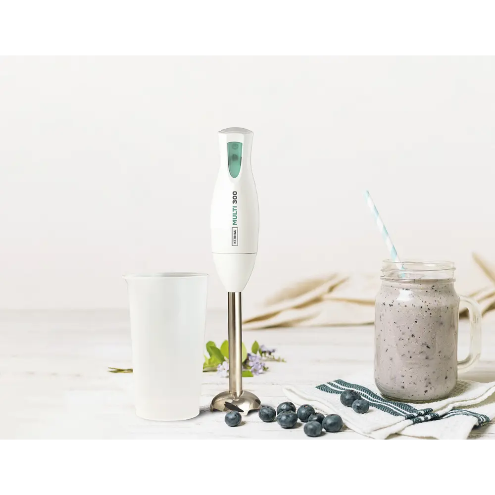 Ручной блендер мощностью 300 Вт это элегантное и практичное устройство, которое стало незаменимым помощником уже на многих кухнях. Устройство имеет мощность 300 Вт и 1 уровень мощности. Безусловно, Вы легко и быстро создадите шедевральные блюда, которые порадуют каждого своим неповторимым вкусом. Насадка для смешивания изготовлена из нержавеющей стали, а это значит, что ее можно использовать для измельчения продуктов высокой температуры. Товар также оборудован чашкой для смешивания. Он прост и удобен для повседневного использования. Эргономичная форма и легко снимаемый наконечник, делают его элегантным, комфортным и функциональным. Это – практичный помощник на каждой кухне.