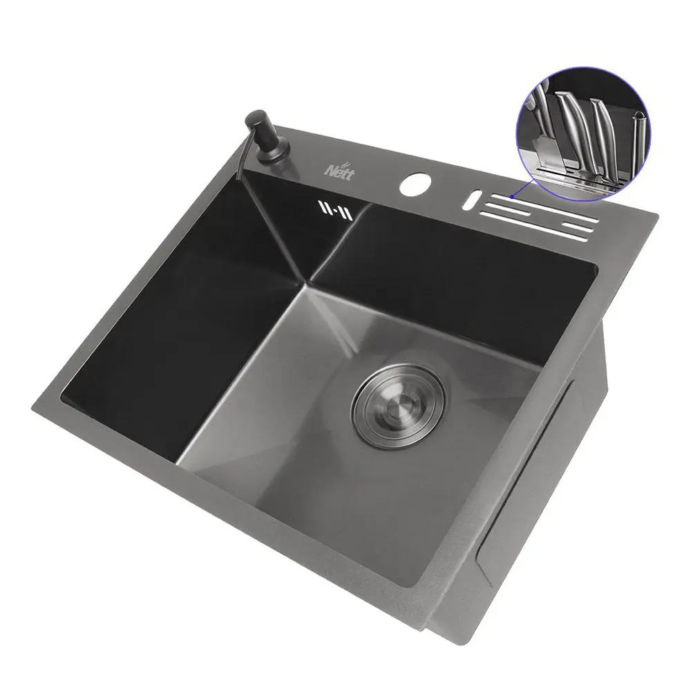 Ми представляємо мийку нового покоління з інтегрованим отвором для ножів. Забудьте про необхідність додаткової підставки та звільніть простір на стільниці, уникнувши накопичення бруду.