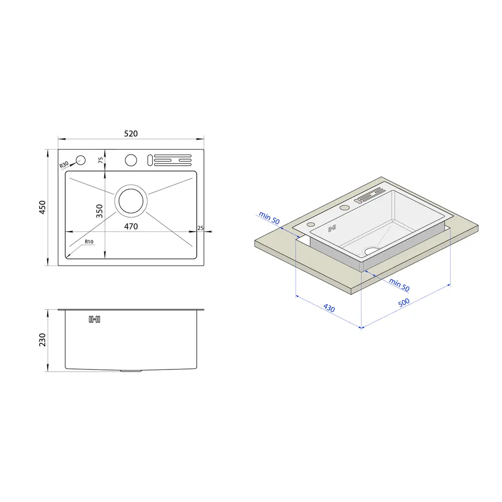 Стандартні розміри 52*45 см та універсальні кріплення дозволяють інтегрувати мийку у будь-який дизайн кухні та будь-яку стільницю.