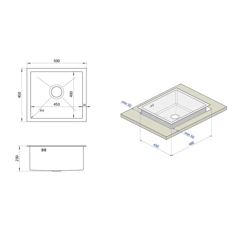 Стандартні габарити 50*45 см роблять цю мийку ідеальним вибором для будь-якої кухні, дозволяючи встановлювати її як у кам'яні стільниці, так і поверх них.