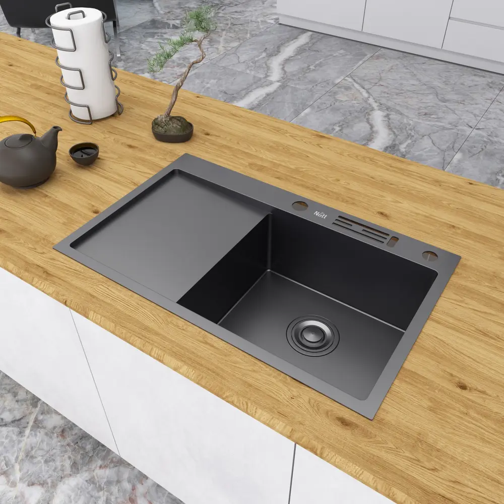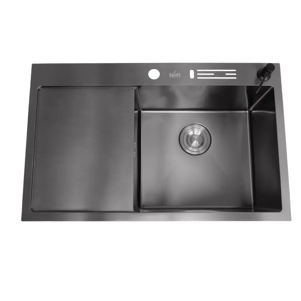 Мийка з крилом пофарбована в чорний колір і оброблена спеціальним покриттям Nano PVD, стійким до подряпин і корозії.