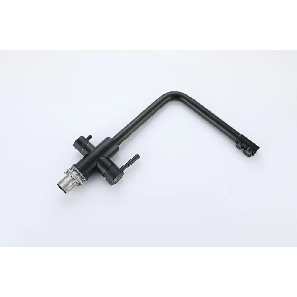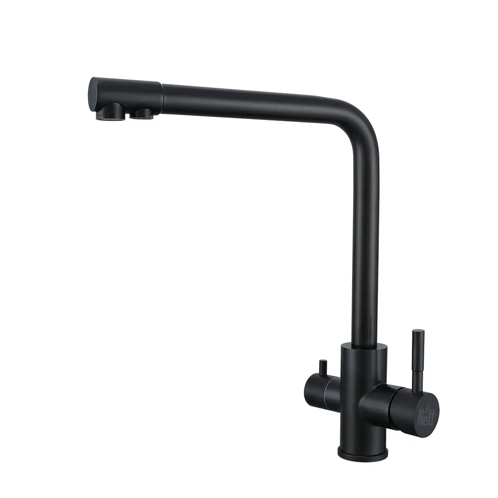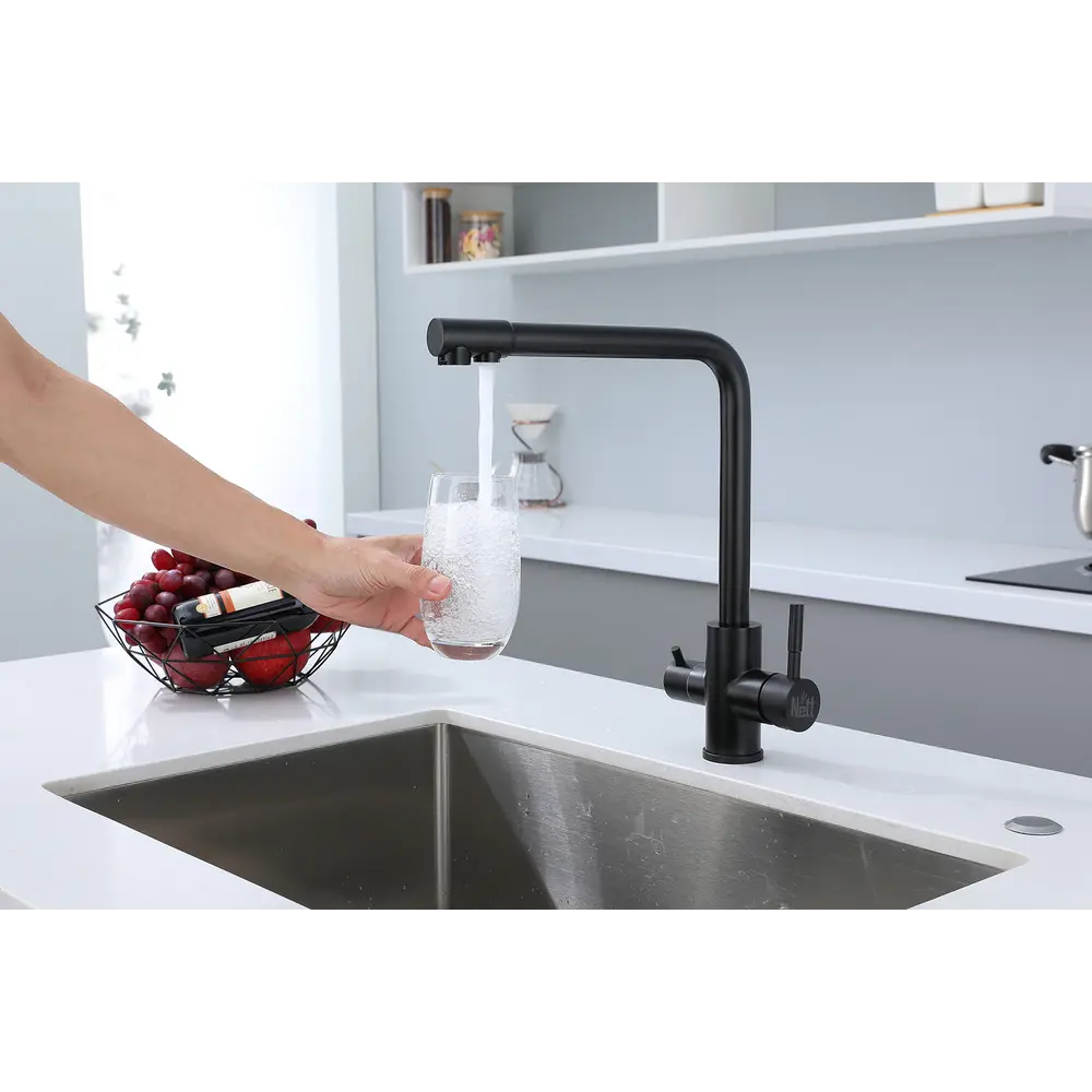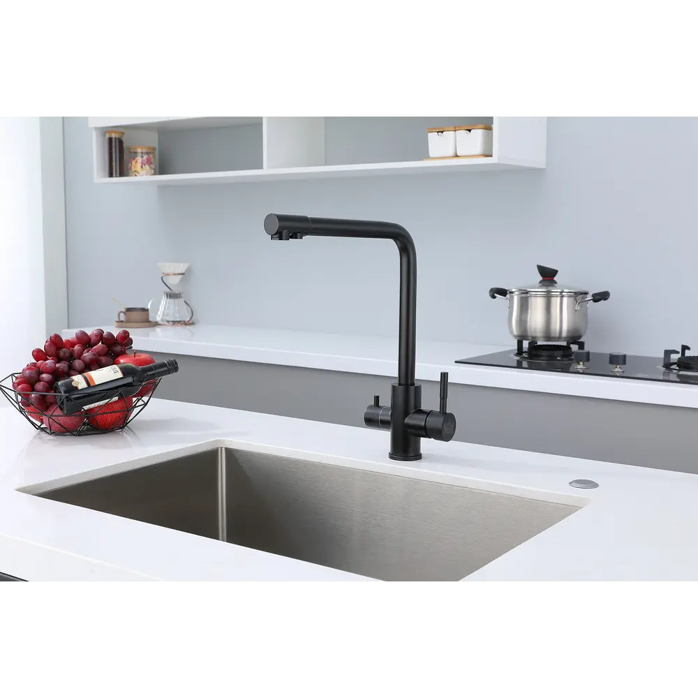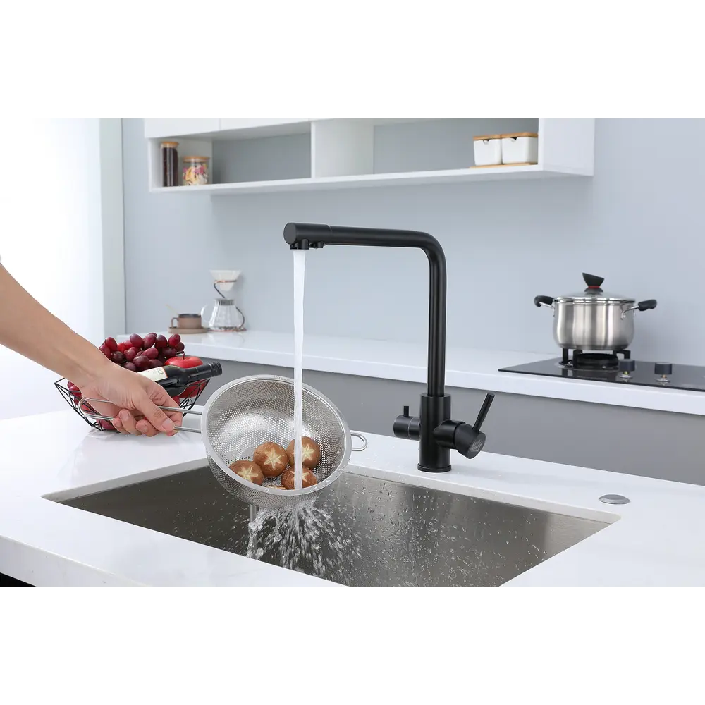 Цей змішувач можна підключити одночасно до водопровідної та фільтрованої води. Управління потоком води регулюється двома важелями: для фільтрованої води і для змішування гарячої та холодної води.
