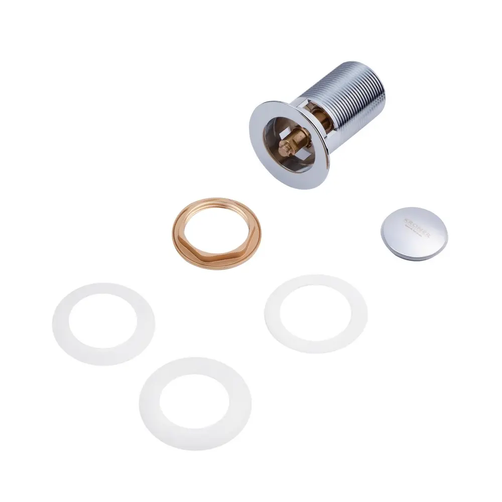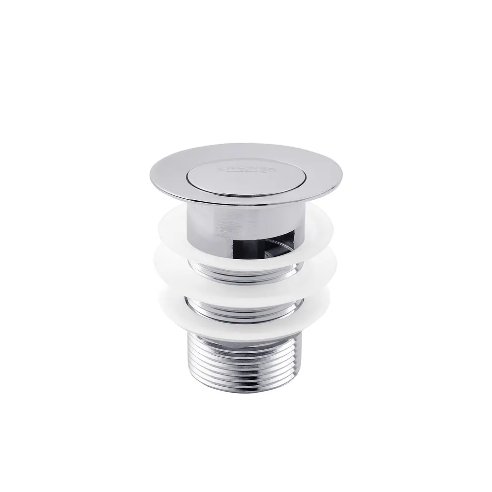 Донный клапан для раковины Kroner KRM-C962-1 1 1/4" с переливом выполнен из латуни в хромированном цвете, что дает возможность сочетать его с раковинами с таким же покрытием. Изделие позволит перекрыть сливное отверстие в случае необходимости и использовать раковину как таз, а наличие перелива убережет вас от потопа, если вы ненадолго отвлеклись во время набирания воды. Клапан монтируется не более 5ти минут и управляется нажатием на крышку в виде круглой кнопки. Соединение универсальное.