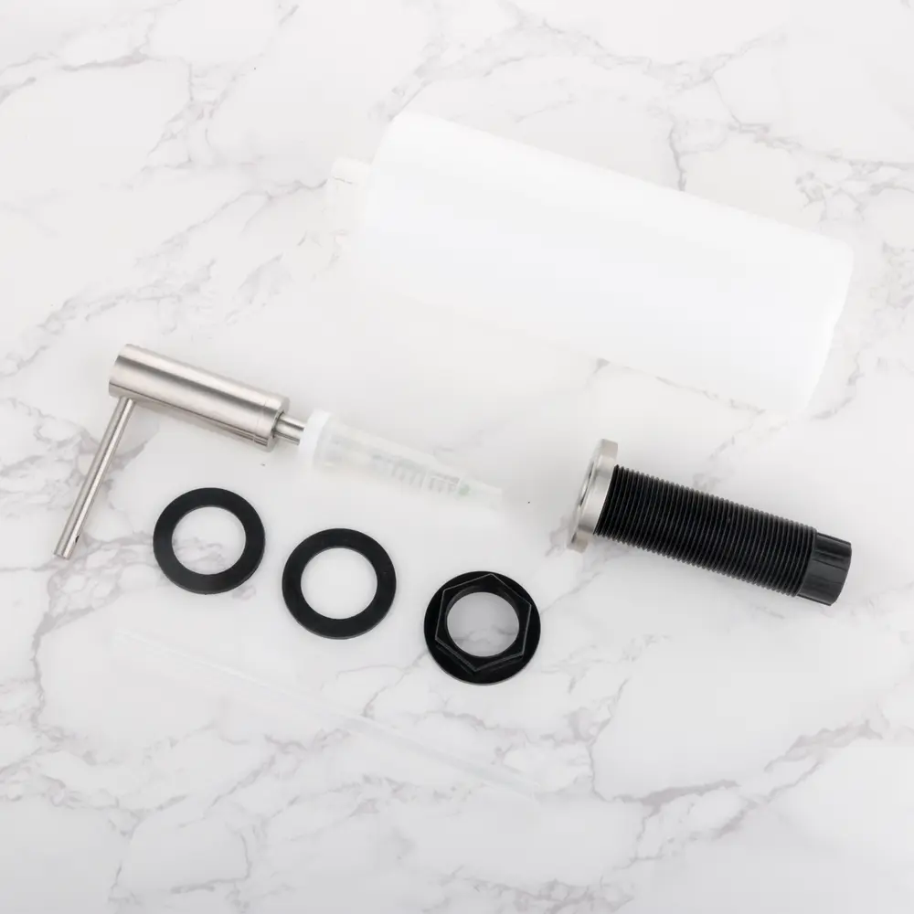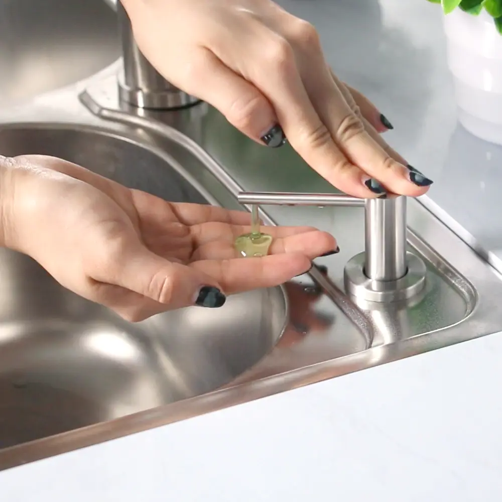 Дозатор для миючого засобу Nett встановлюється на кухонну мийку або на стільницю, діаметр отвору 30 мм, і дозволяє звільнити простір поруч з мийкою від ємностей з миючими засобами. Головка дозатора виконаний з нержавіючої сталі 304 марки з брашированним покриттям.