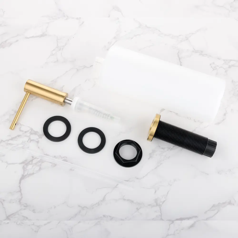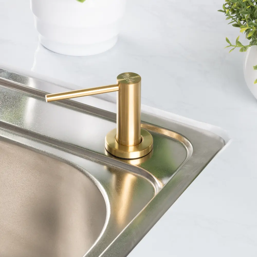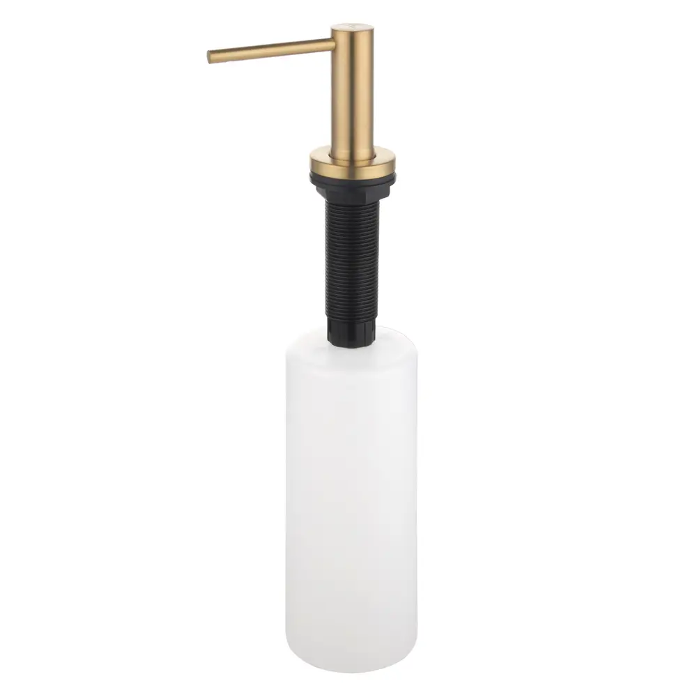 Дозатор для миючого засобу Nett встановлюється на кухонну мийку або на стільницю, діаметр отвору 30 мм, і дозволяє звільнити простір поруч з мийкою від ємностей з миючими засобами. Головка дозатора виконаний з нержавіючої сталі 304 марки з золотим матовим покриттям.
