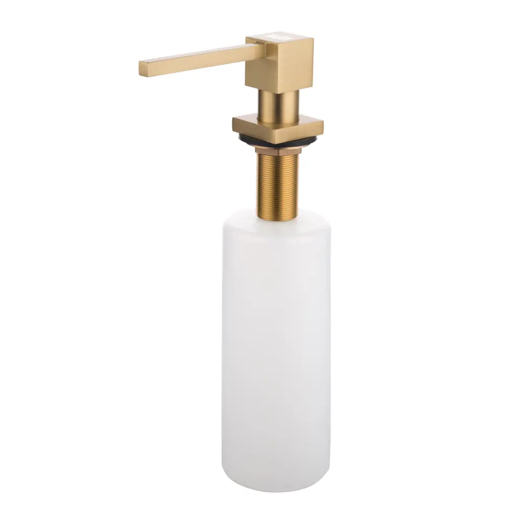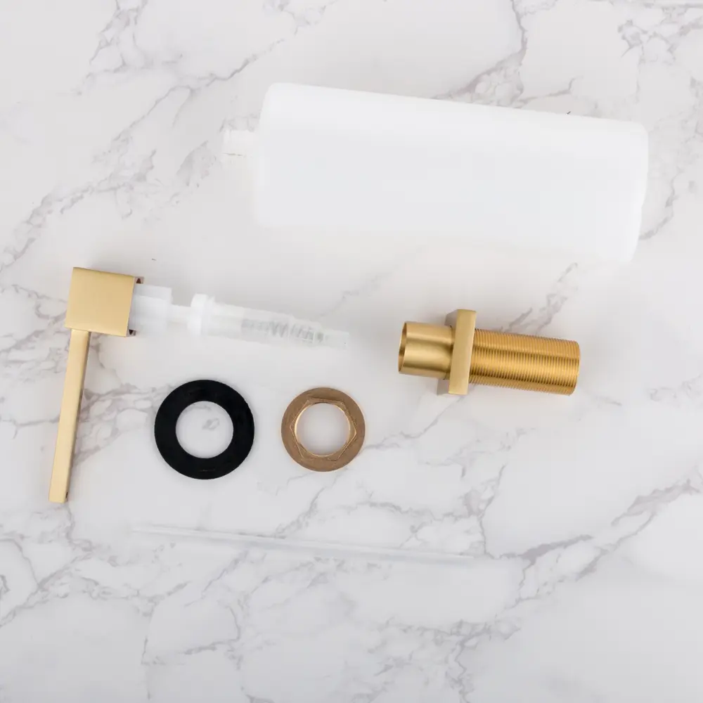 Дозатор для миючого засобу Nett встановлюється на кухонну мийку або на стільницю, діаметр отвору 30 мм, і дозволяє звільнити простір поруч з мийкою від ємностей з миючими засобами. Головка дозатора виконаний з нержавіючої сталі 304 марки з золотим матовим покриттям.
