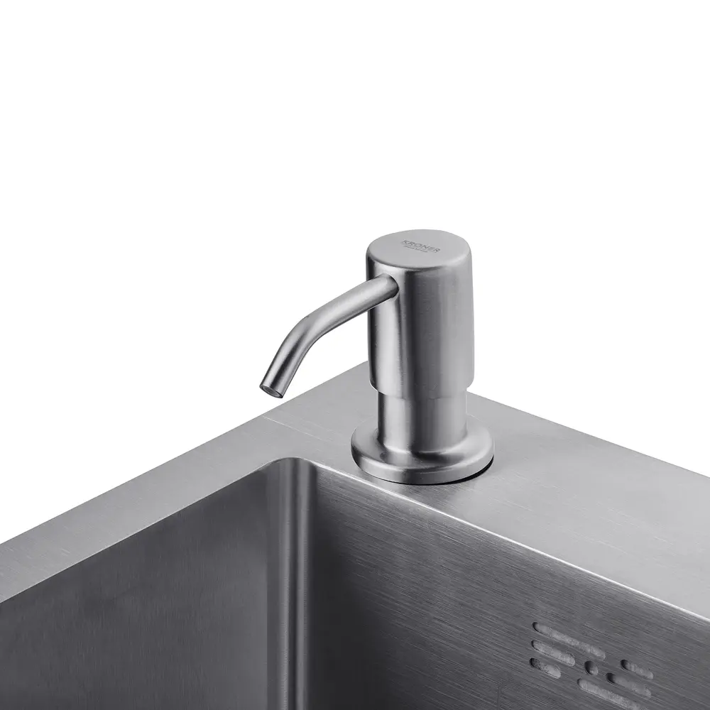 Встраиваемый дозатор Kroner KRP Spender-ECG049 станет универсальной изюминкой в интерьере современной кухни или и ванной комнаты. Диспенсер — это незаменимый аксессуар, который выполняет несколько функций. Во-первых, экономия расхода моющего средства или жидкого мыла. Во-вторых, избавляет от визуального шума. При монтаже встраиваемый аксессуар фиксируют в отверстии столешницы или мойки таким образом, чтобы пластиковая емкость была скрыта внутри, что придает пространству аккуратный вид. Благодаря прозрачным стенкам удобно контролировать расход моющего средства. Он состоит из пластиковой емкости 480 мл, и помпы - из высококачественной нержавеющей стали, которая ее герметично закрывает. Оснащен системой подачи моющего средства с дополнительным каналом, исключающим контакт жидкости с латунными деталями. Аксессуар обладает повышенной прочностью, устойчив к агрессивному воздействию внешней среды и рассчитан на длительную эксплуатацию. Максимальная толщина столешницы 60 мм. Диаметр отверстия для установки 25 мм.