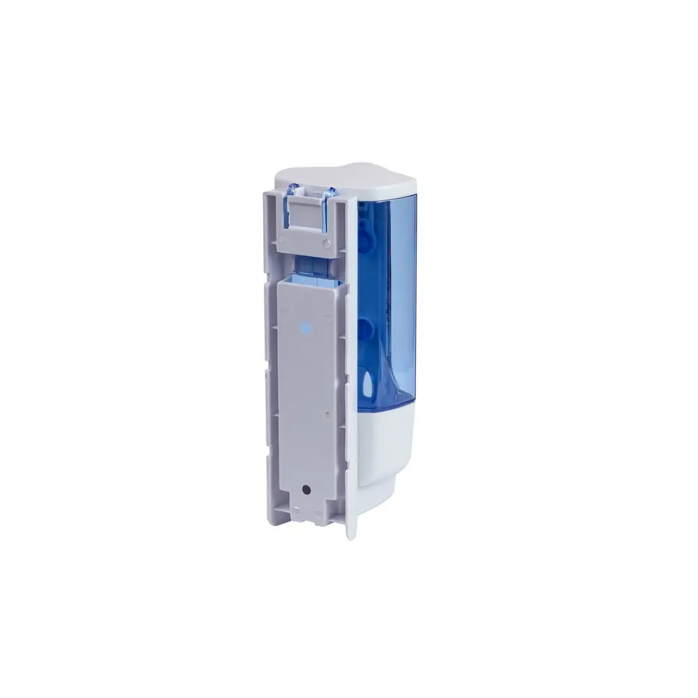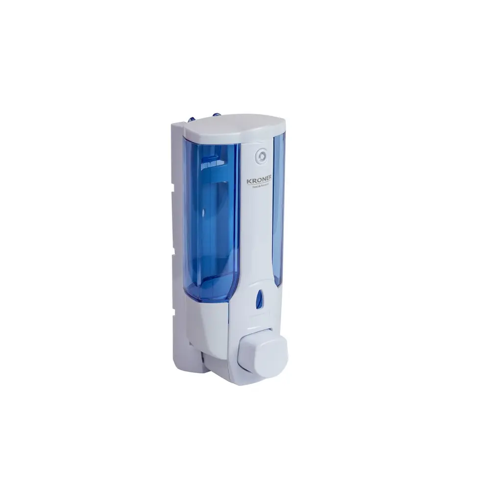 Диспенсер для жидкого мыла KRM Rizze-ACP403 от Kroner с одинарным пластиковым резервуаром рассчитан на 380 мл. Подача мыла происходит при нажатии на кнопку. Диспенсер крепится на стену в любом удобном месте шурупами, которые входят в комплект. Окошки выполнены из прозрачного голубого пластика для контроля остатка мыла. Пластик устойчив к влаге и прост в очистке.