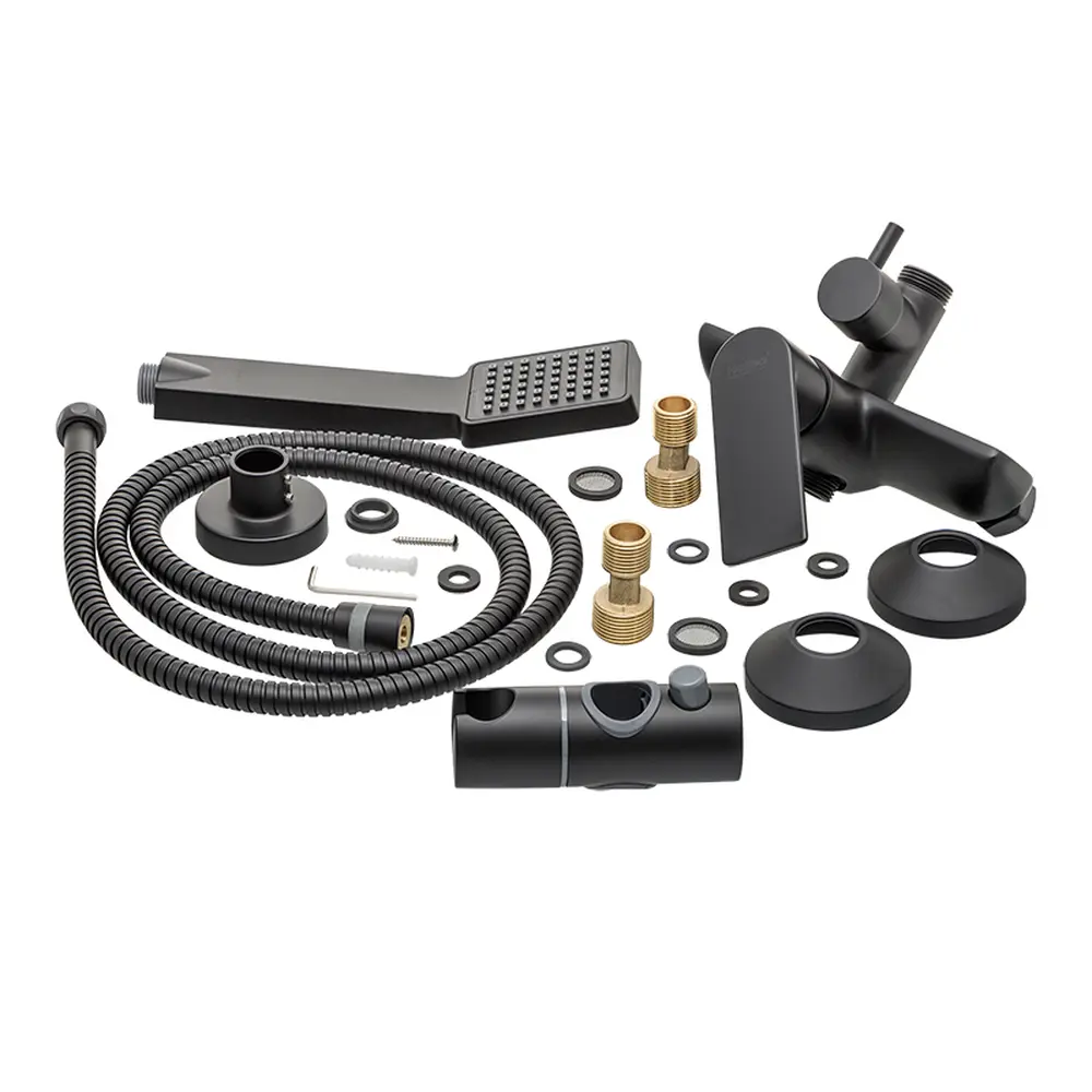 Шланг 150 см, ручна лійка, стельова лійка, подовжувач 30 см, чашки, ексцентрики, гумові прокладки, тримач для лійки