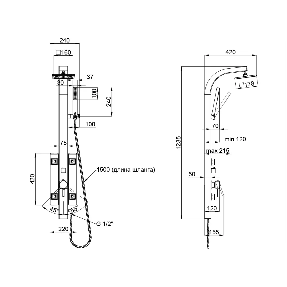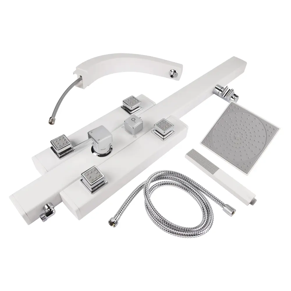 Душова панель, Змішувач, Душові форсунки: 4шт, Лійка для верхнього душу, Кронштейн для ручного душу, Лійка для ручного душу, Душовий шланг, Кріпильні деталі