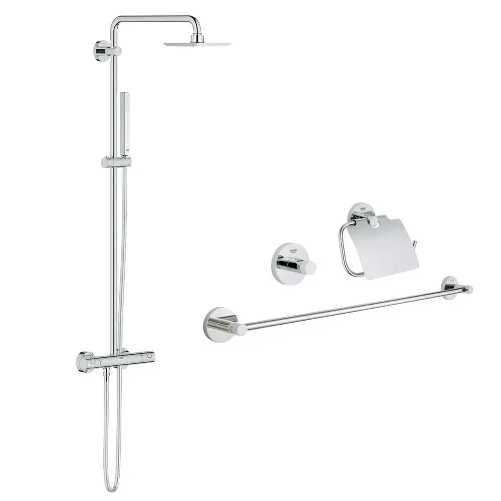 Комплект Grohe душевая система Euphoria 27932000 + набор аксессуаров Essentials 40775001 - это все, что необходимо для создания стильной ванной комнаты. Душевая система состоит из душевой стойки с верхним и ручным душем, а также удобного смесителя. Долговечность и износостойкость изделий гарантируется благодаря хромированном покрытию. Термостатический смеситель обеспечит автоматический контроль смешивания воды. В состав входит держатель для полотенец, крючок для одежды, держатель туалетной бумаги.