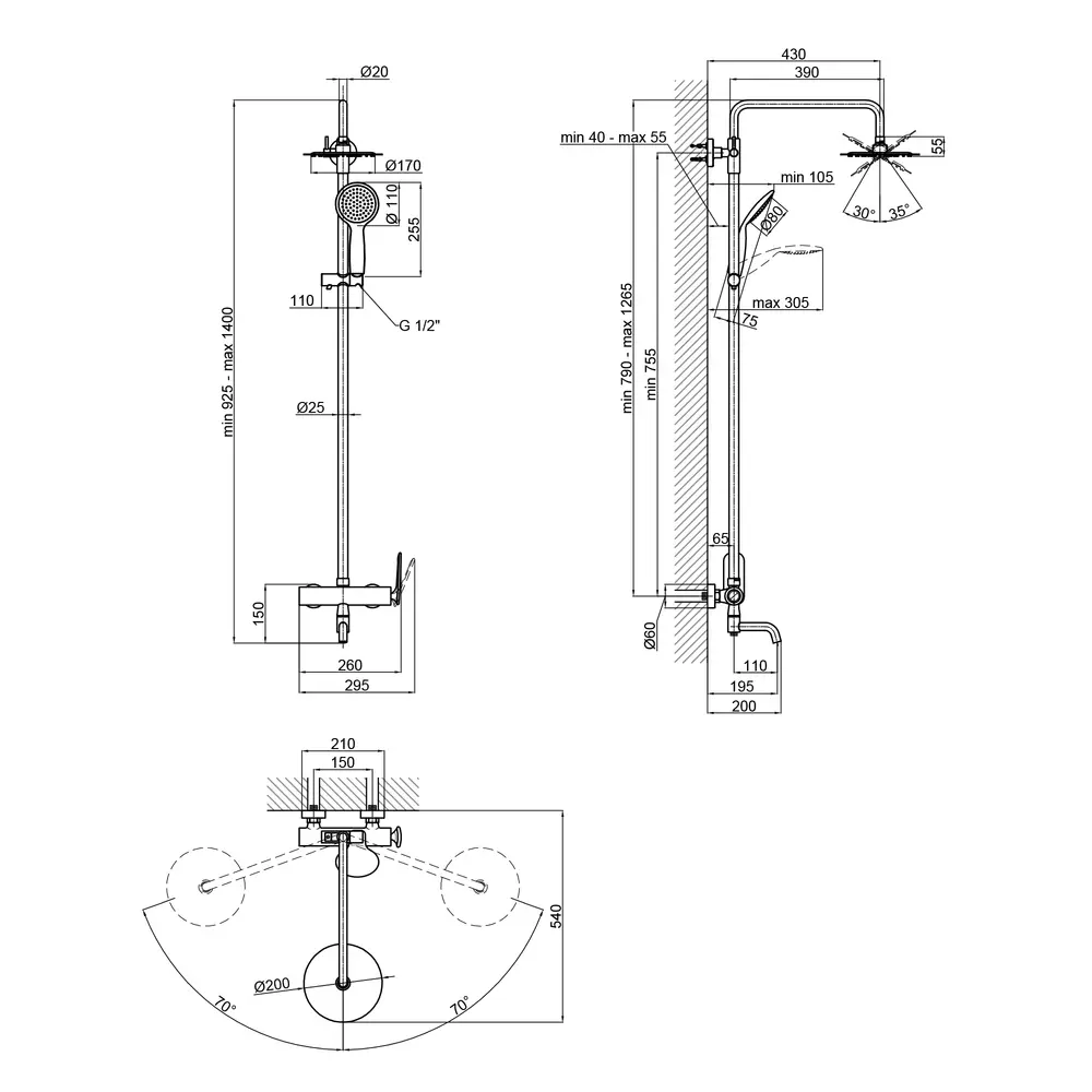 Змішувач, Кронштейн для верхнього душу, Лійка для верхнього душу, Кронштейн для ручного душу, Лійка для ручного душу, Душовий шланг, Душова стійка, Кріплення