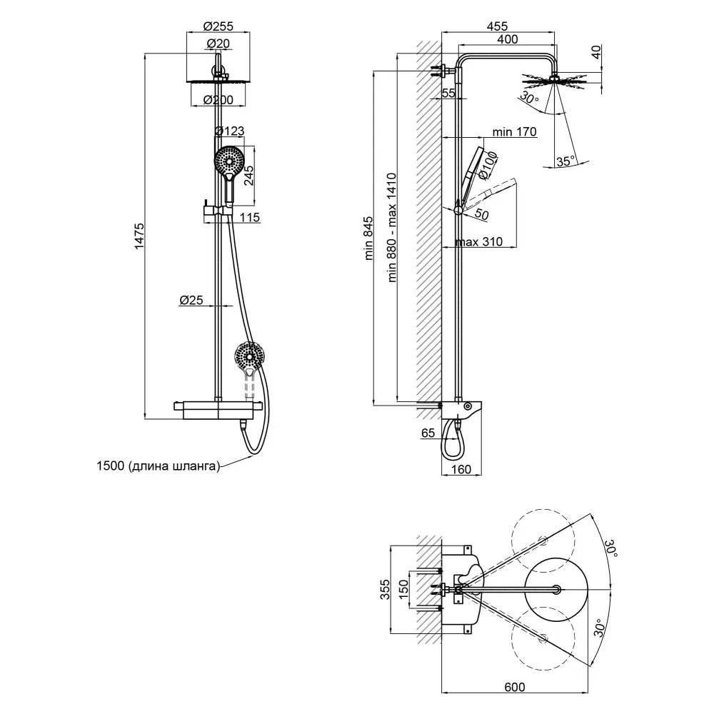 Змішувач, Кронштейн для верхнього душу, Лійка для верхнього душу, Кронштейн для ручного душу, Лійка для ручного душу, Душовий шланг, Душова стійка, Кріпильні деталі
