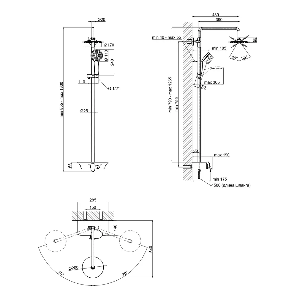 Змішувач, Кронштейн для верхнього душу, Лійка для верхнього душу, Кронштейн для ручного душу, Лійка для ручного душу, Душовий шланг, Душова стійка, Кріплення