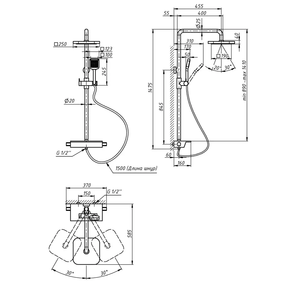 Змішувач, Кронштейн для верхнього душу, Лійка для верхнього душу, Кронштейн для ручного душу, Лійка для ручного душу, Душовий шланг, Душова стійка, Рівень, Кріпильні деталі