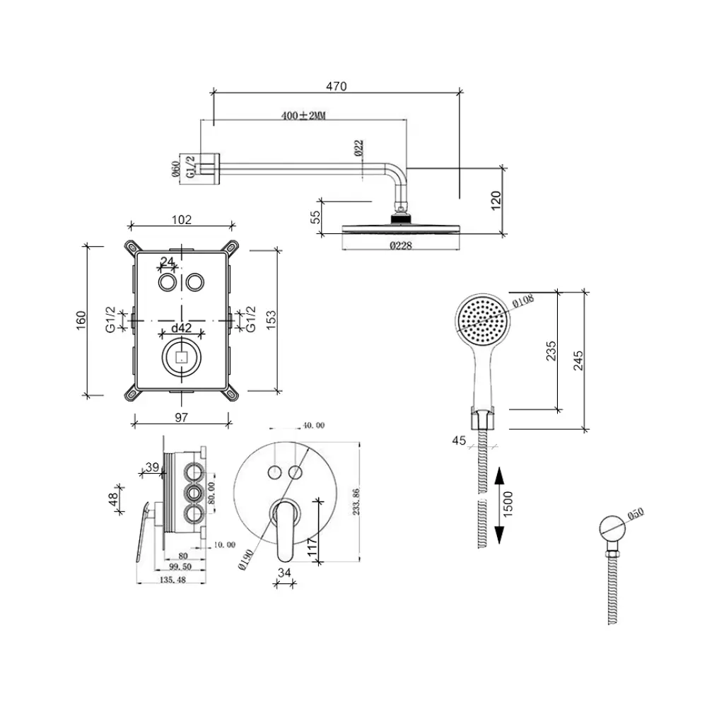 Змішувач, Кронштейн для верхнього душу, Лійка для верхнього душу, Кронштейн для ручного душу, Шланг під'єднення, Лійка для ручного душу, Душовий шланг, Кріпильні деталі