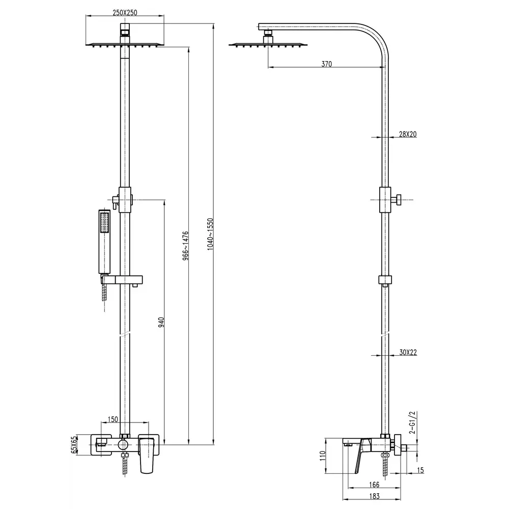 Вид монтажа душевой системы: настенный, на 2 выхода воды