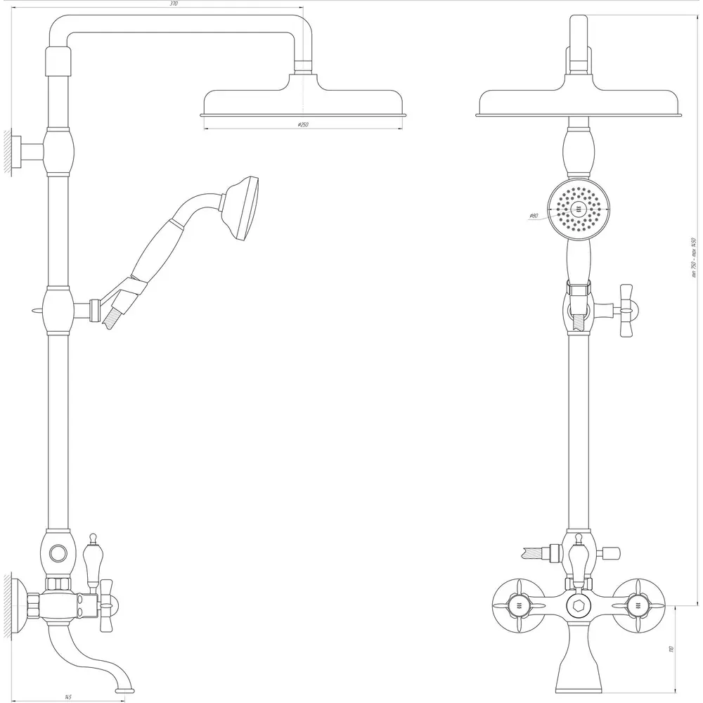 - Верхний душ - круглая воронка Ø 25 см, стойка.