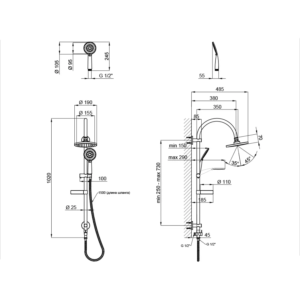 Кронштейн для верхнього душу, Лійка для верхнього душу, Кронштейн для ручного душу, Лійка для ручного душу, Душовий шланг, Душова стійка, Мильниця, Шланг під'єднення, Кріпильні деталі