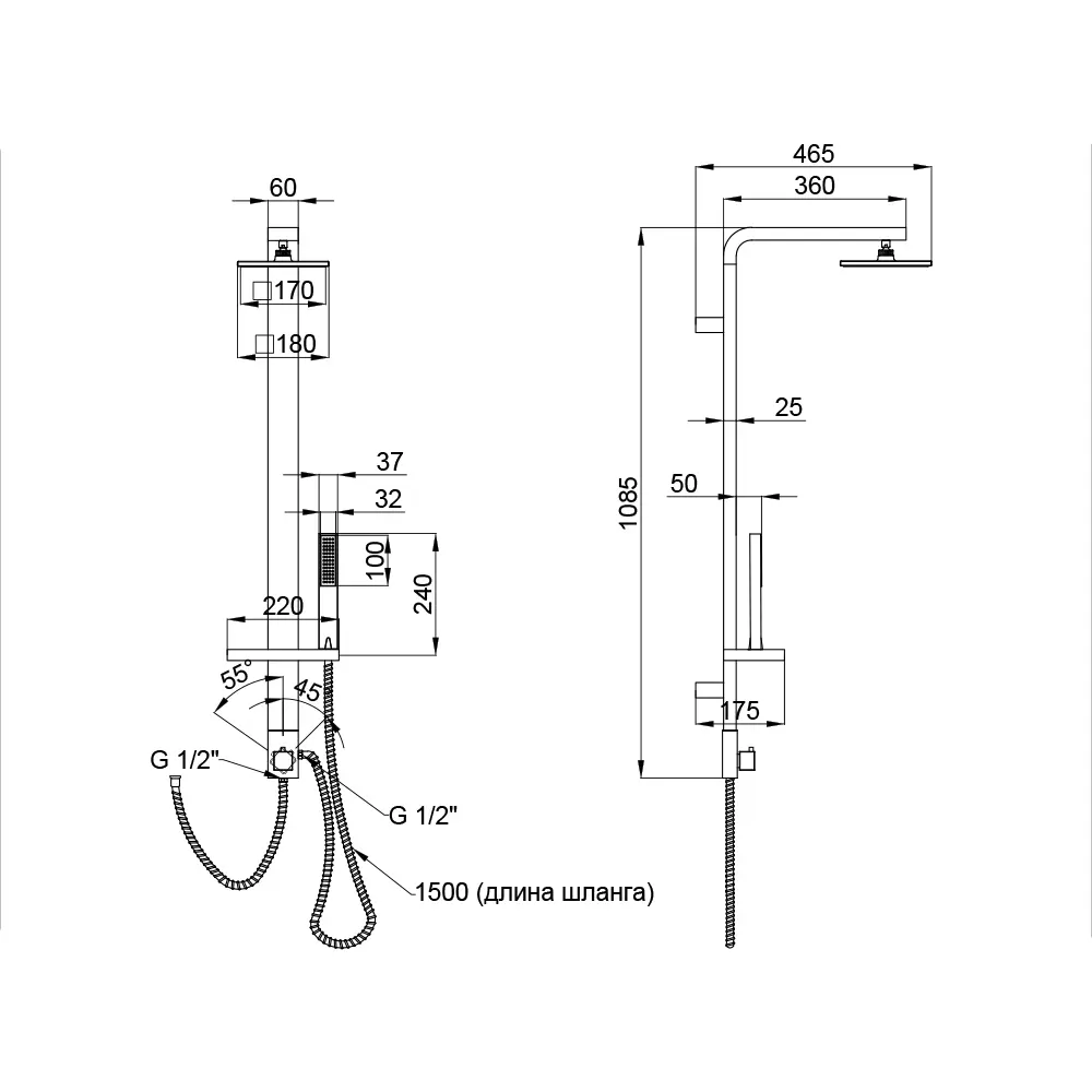 Кронштейн для верхнього душу, Лійка для верхнього душу, Мильниця з кронштейном, Лійка для ручного душу, Душовий шланг, Душова стійка, Шланг під'єднення, Кріпильні деталі