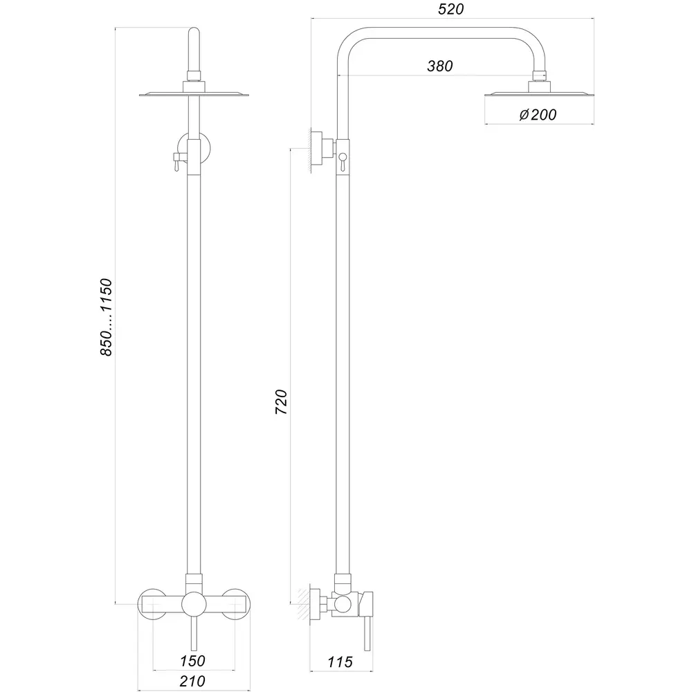 - верхній душ - кругла лійка ø20 см, стійка (80-110 см)