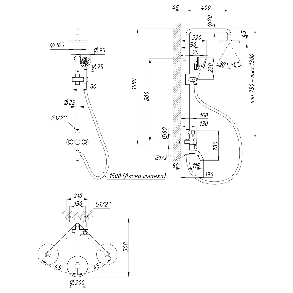 Змішувач, Кронштейн для верхнього душу, Лійка для верхнього душу, Кронштейн для ручного душу, Лійка для ручного душу, Душовий шланг, Душова стійка, Кріплення