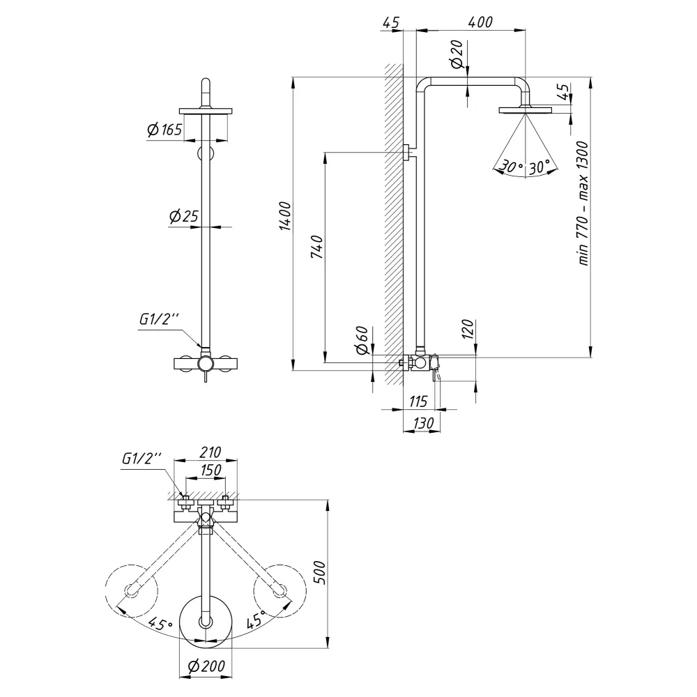 Душова стійка, Змішувач, Кронштейн для верхнього душу, Лійка для верхнього душу, Кріплення