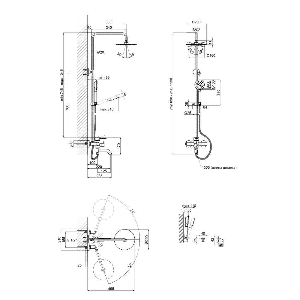 Змішувач, Кронштейн для верхнього душу, Лійка для верхнього душу, Кронштейн для ручного душу, Лійка для ручного душу, Душовий шланг, Душова стійка, Кріплення