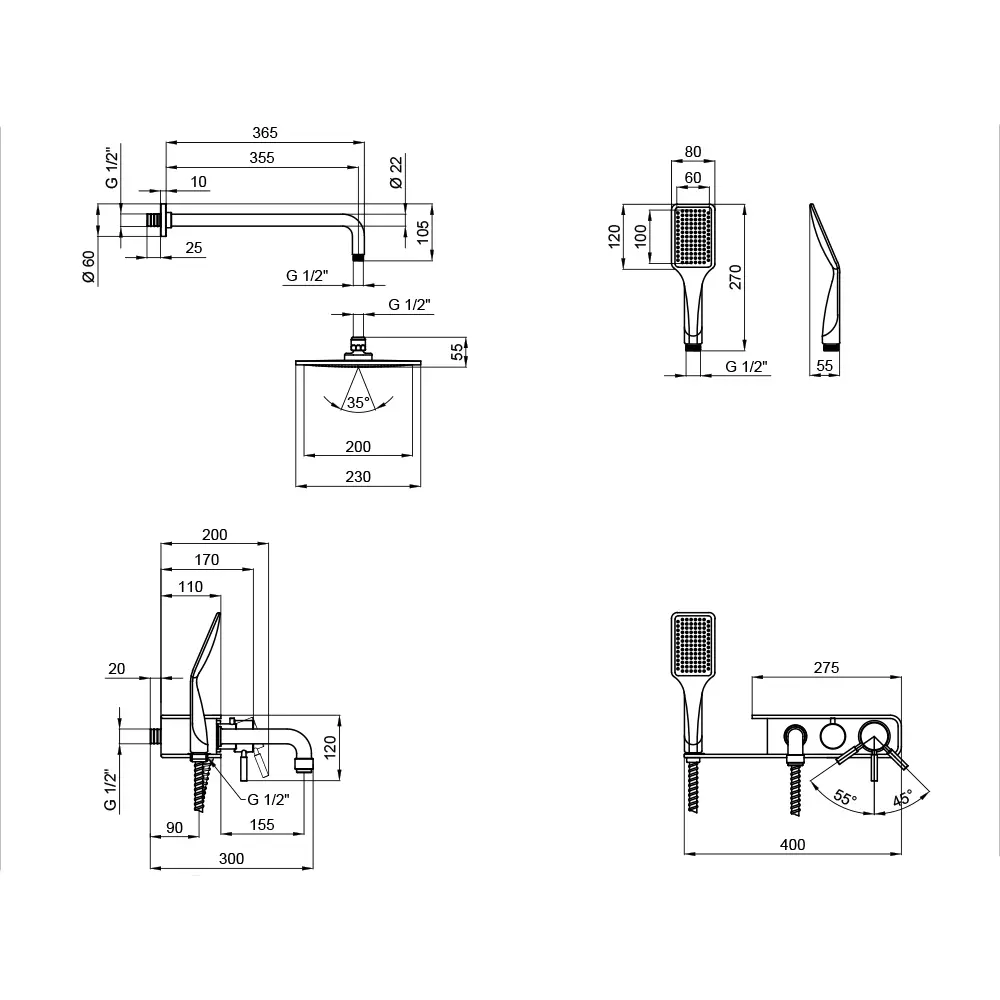 Змішувач з полицею, Кронштейн для верхнього душу, Лійка для верхнього душу, Лійка для ручного душу, Душовий шланг, Кріпильні деталі