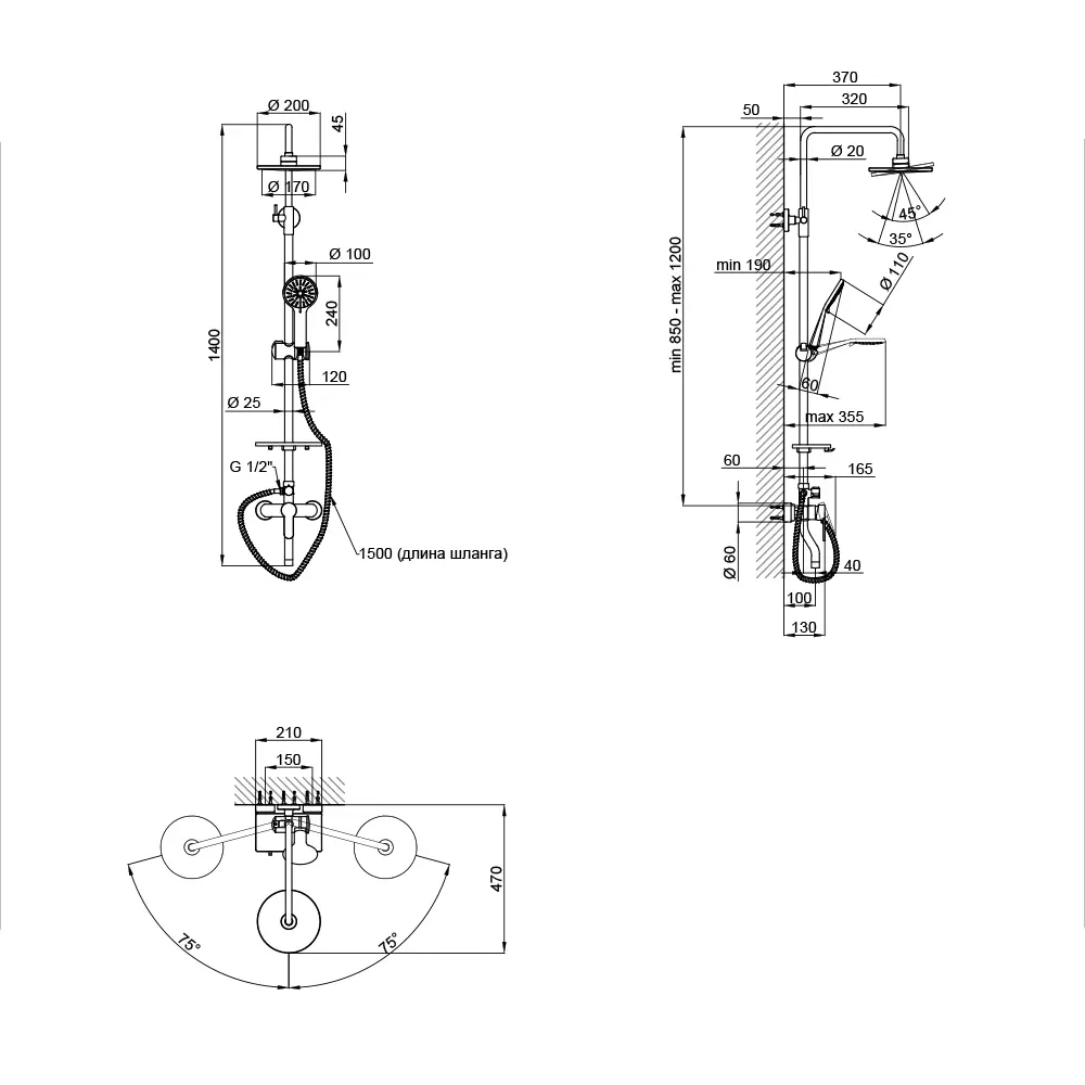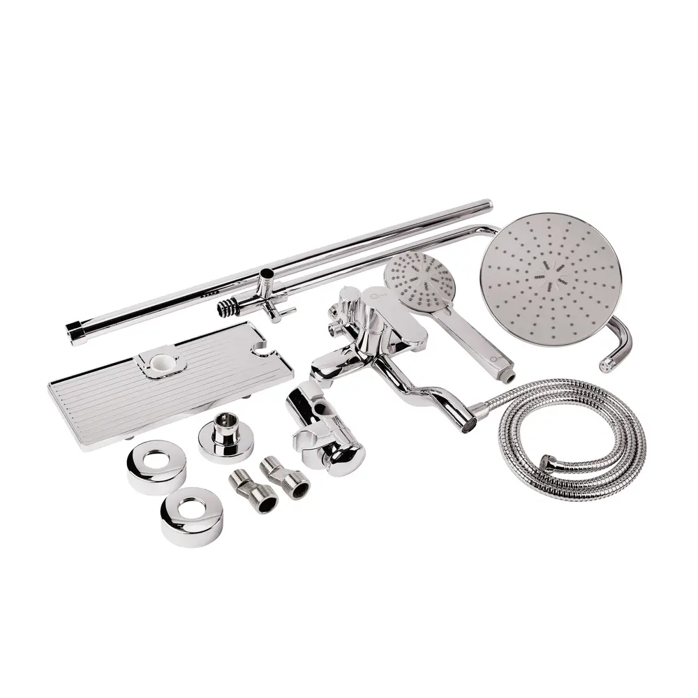 Змішувач, Кронштейн для верхнього душу, Лійка для верхнього душу, Кронштейн для ручного душу, Лійка для ручного душу, Душовий шланг, Душова стійка, Полиця, Кріпильні деталі