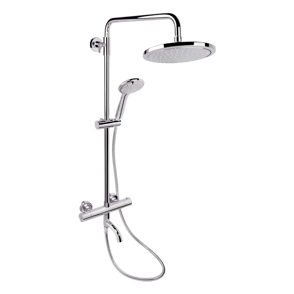 Душова система Qtap Inspai-Therm CRM T300130 забезпечить максимально комфортний прийом душу. Вона складається з телескопічної душової стійки з фіксованим верхнім і гнучким ручним душем та змішувача. Тривалий термін служби забезпечують довговічна, зносостійка латунь, яка не підпадає під вплив іржі та міцний пластик, з яких виготовлено виріб.