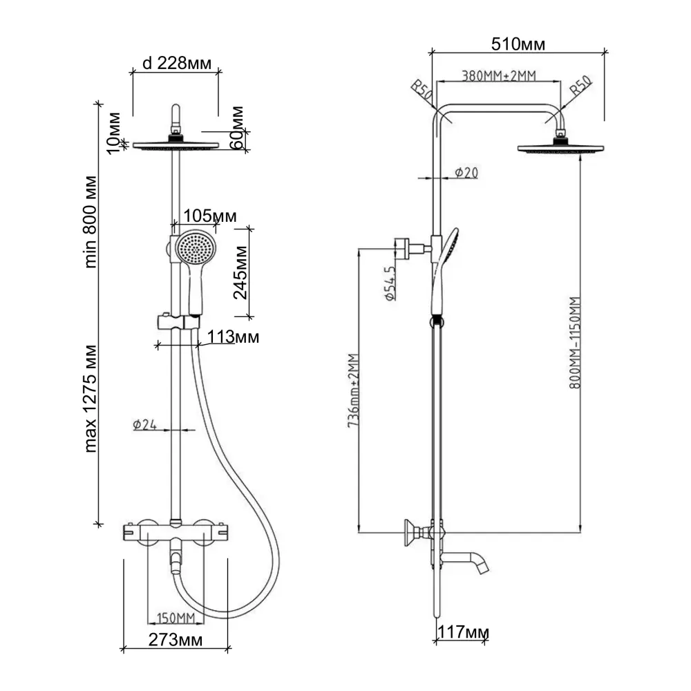 Змішувач, Кронштейн для верхнього душу, Лійка для верхнього душу, Кронштейн для ручного душу, Лійка для ручного душу, Душовий шланг, Душова стійка, Кріпильні деталі