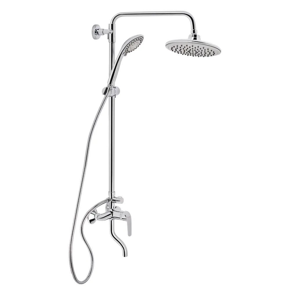 Душова система Qtap Sloup 51104OC забезпечить максимально комфортний прийом душу. Вона складається з телескопічної душової стійки з фіксованим верхнім і компактним ручним душем і змішувача. Тривалий термін служби забезпечують зносостійка латунь і міцний пластик, з яких виготовлено виріб. Лійка для ручного душу має 5 режимів подачі струменя. Керування потоком води здійснюється за допомогою важеля і поворотного дивертора.