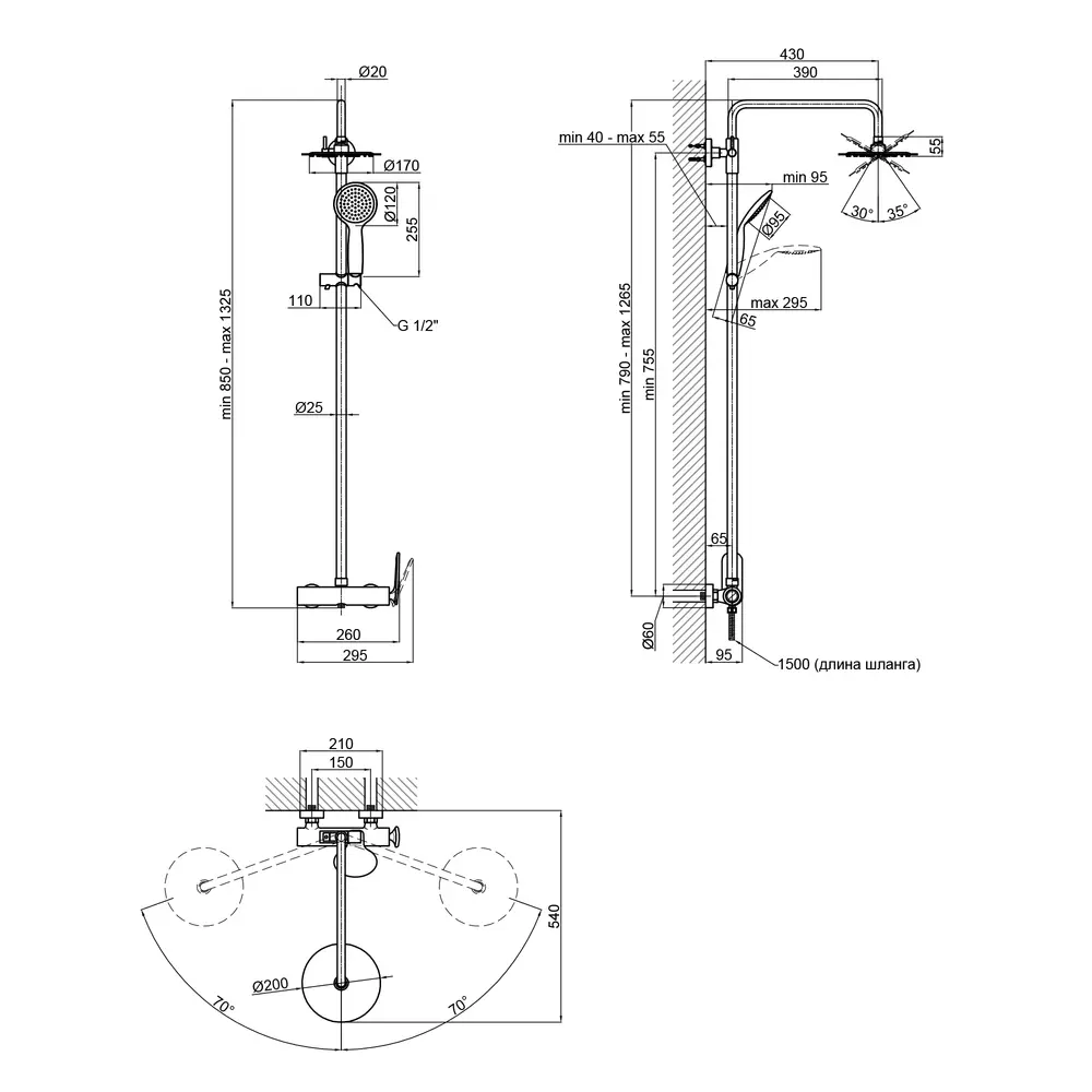 Змішувач, Кронштейн для верхнього душу, Лійка для верхнього душу, Кронштейн для ручного душу, Лійка для ручного душу, Душовий шланг, Душова стійка, Рівень, Кріплення