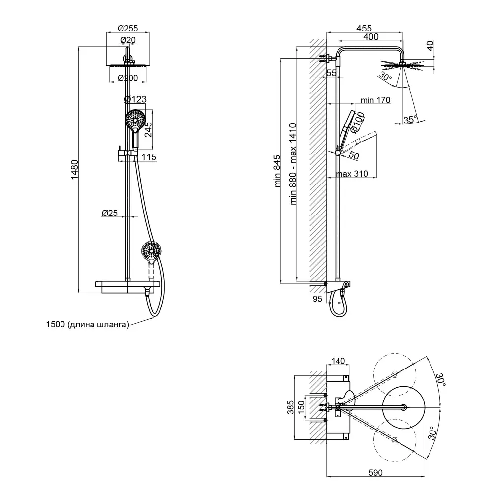 Змішувач, Кронштейн для верхнього душу, Лійка для верхнього душу, Кронштейн для ручного душу, Лійка для ручного душу, Душовий шланг, Душова стійка, Кріпильні деталі
