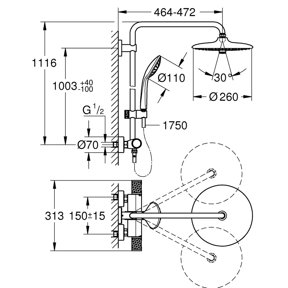 Обмежувач температури, поворотна верхня частина, регулювання ручного душу по висоті, рифлені ручки