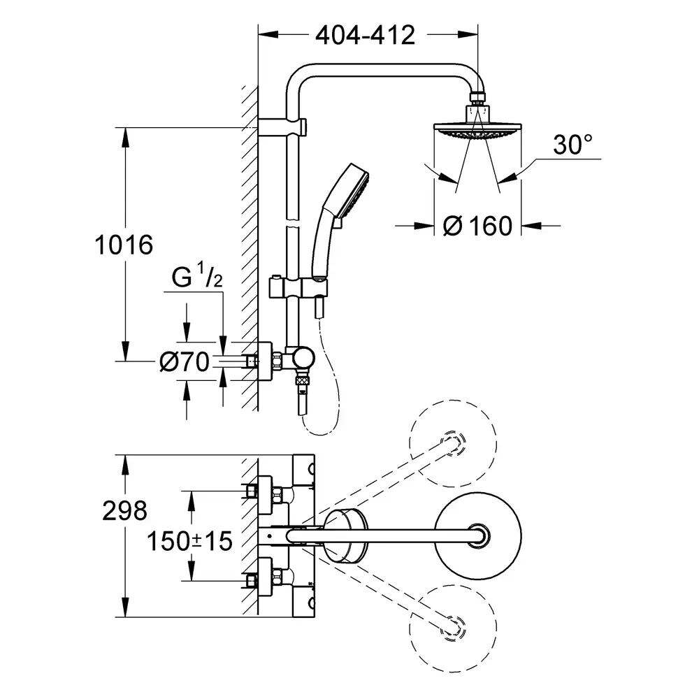 Обмежувач температури, поворотний кронштейн верхнього душу, регулювання ручного душу по висоті