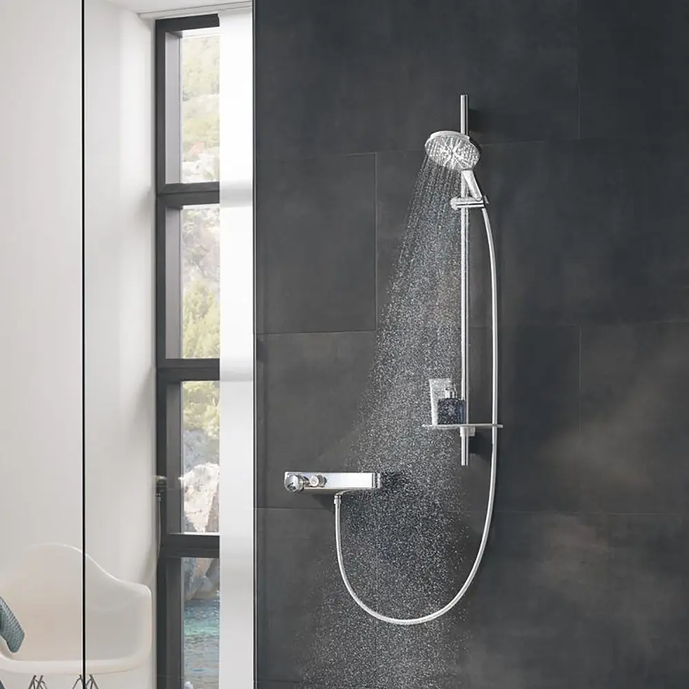 Душовий гарнітур Grohe Rainshower Smartactive 150 26593000 - функціональний, зручний і надійний душовою атрибут. Він складається з штанги, що ковзає по стійці, кронштейна, лійки для ручного душу з 3 режимами перемикання, душового шланга і полички. Якісне хромоване покриття додає привабливий зовнішній вигляд і продовжить експлуатаційний термін виробу.