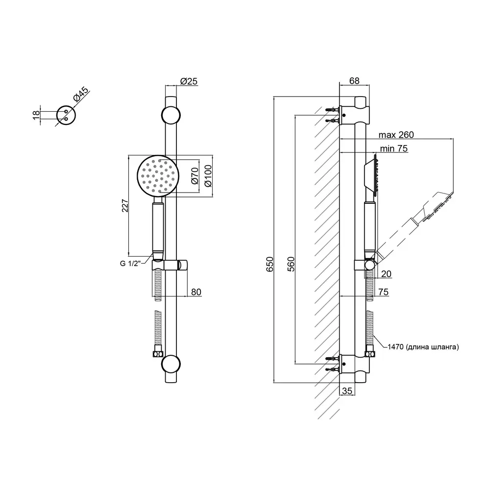 Душова стійка, Кронштейн для ручного душу, Лійка для ручного душу, Душовий шланг, Кріпильні деталі