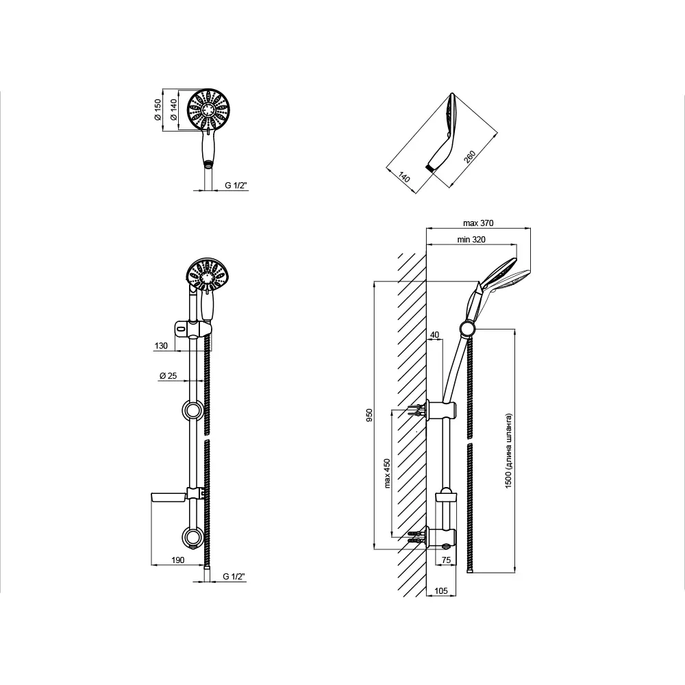 Душова стійка, Кронштейн для ручного душу, Лійка для ручного душу, Мильниця, Душовий шланг, Кріпильні деталі