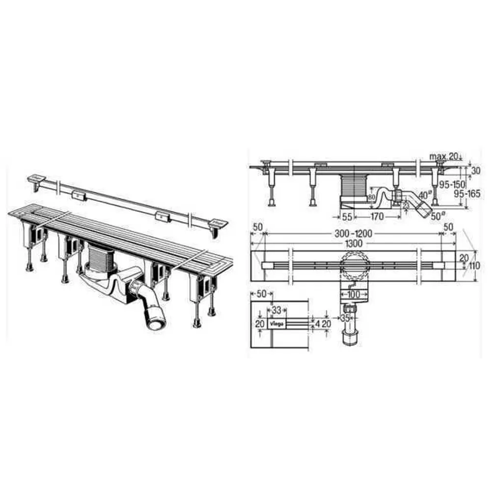 Душевой лоток Advantix Vario может быть установлен в трех разных вариантах. Например, как прямолинейный элемент в произвольном месте помещения или непосредственно в стене. Дополнительно возможно его угловое исполнение или П-образная форма по периметру всей душевой зоны. По высоте душевой лоток также имеет большой диапазон регулировок. Он может быть установлен высотой от 90 до165 мм, причем даже при минимальной монтажной высоте перепад высот между сливным патрубком и основой составляет 25 мм. При соблюдении минимального уклона возможна прокладка соединительных трубопроводов длиной 2,5 м без необ-ходимости подъема душевого лотка. Пропускная способность в зависимости от монтажной высоты конструкции составляет от 0,4 до 0,8 л / с и может быть удвоена путем соединения двух душевых лотков.