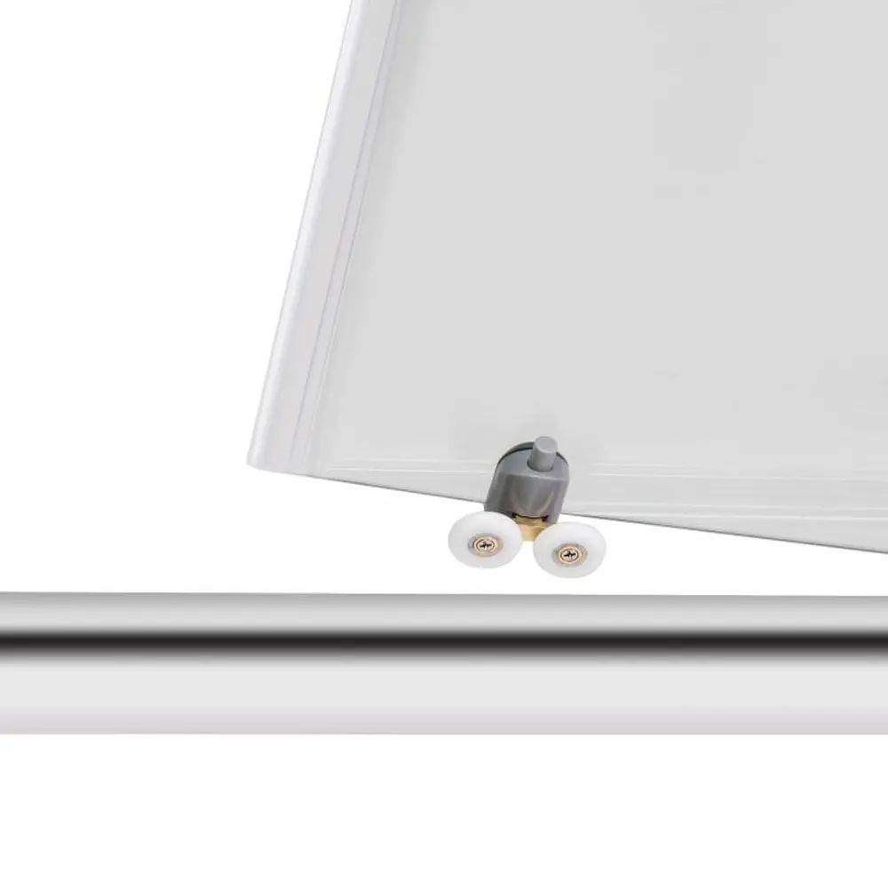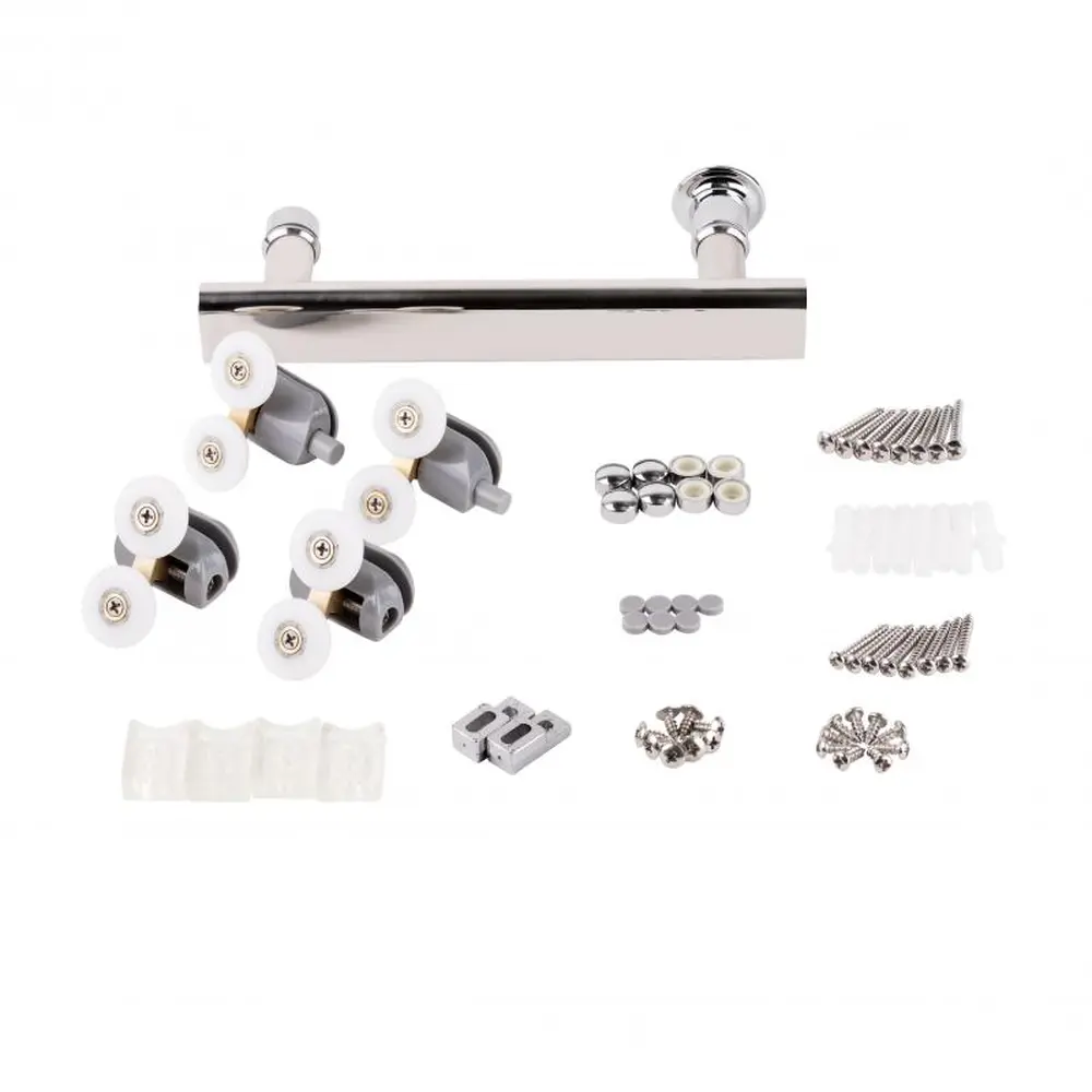 Глухе скло, скляні двері, розширювальні профілі, верхній профіль, нижній профіль, бічні профілі, ручка, подвійні ролики, комплект кріпильних деталей, набір ущільнювачів, заглушки.