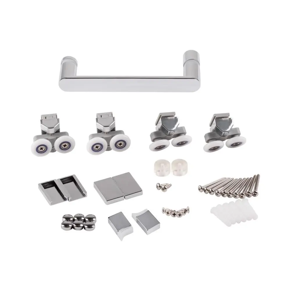 Глухе скло, скляні двері, розширювальні профілі, верхній профіль, нижній профіль, ручка, подвійні ролики, комплект кріпильних деталей, набір ущільнювачів, заглушки.