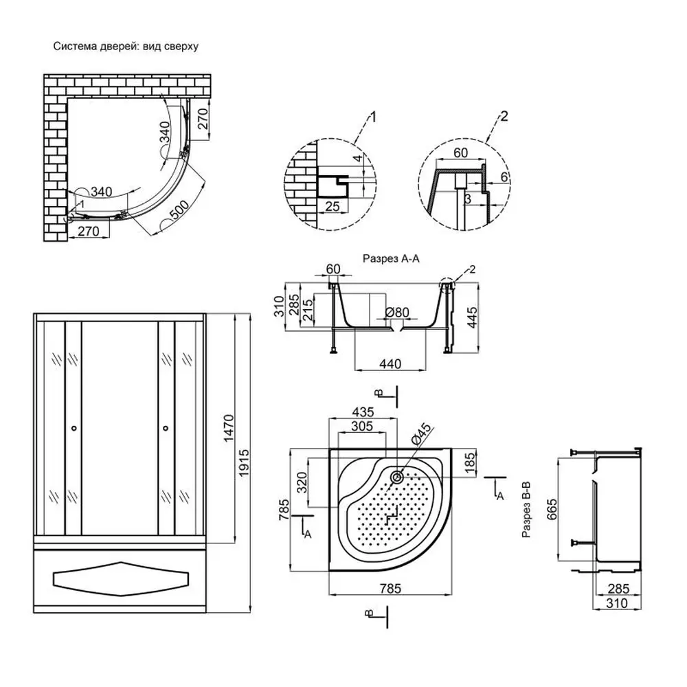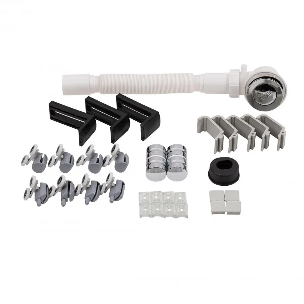 Піддон, сифон, подвійні ролики, ручки, комплект кріпильних деталей, глухе скло, скляні двері, перехідник 32/50 мм, профіль.