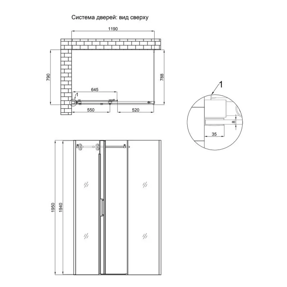 Верхній профіль, металеві ролики, бічна панель, глухе скло, скляні двері, нижній борт, комплект кріплень, ручка, набір ущільнювачів, заглушки.