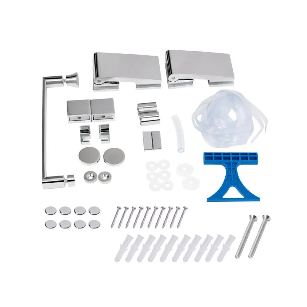 Верхній профіль, нижній борт, бічні профілі, розширювальні профілі, петлі, тримачі скла, комплект кріпильних деталей, заглушки, ручка, набір ущільнювачів, глухе скло, скляні двері.