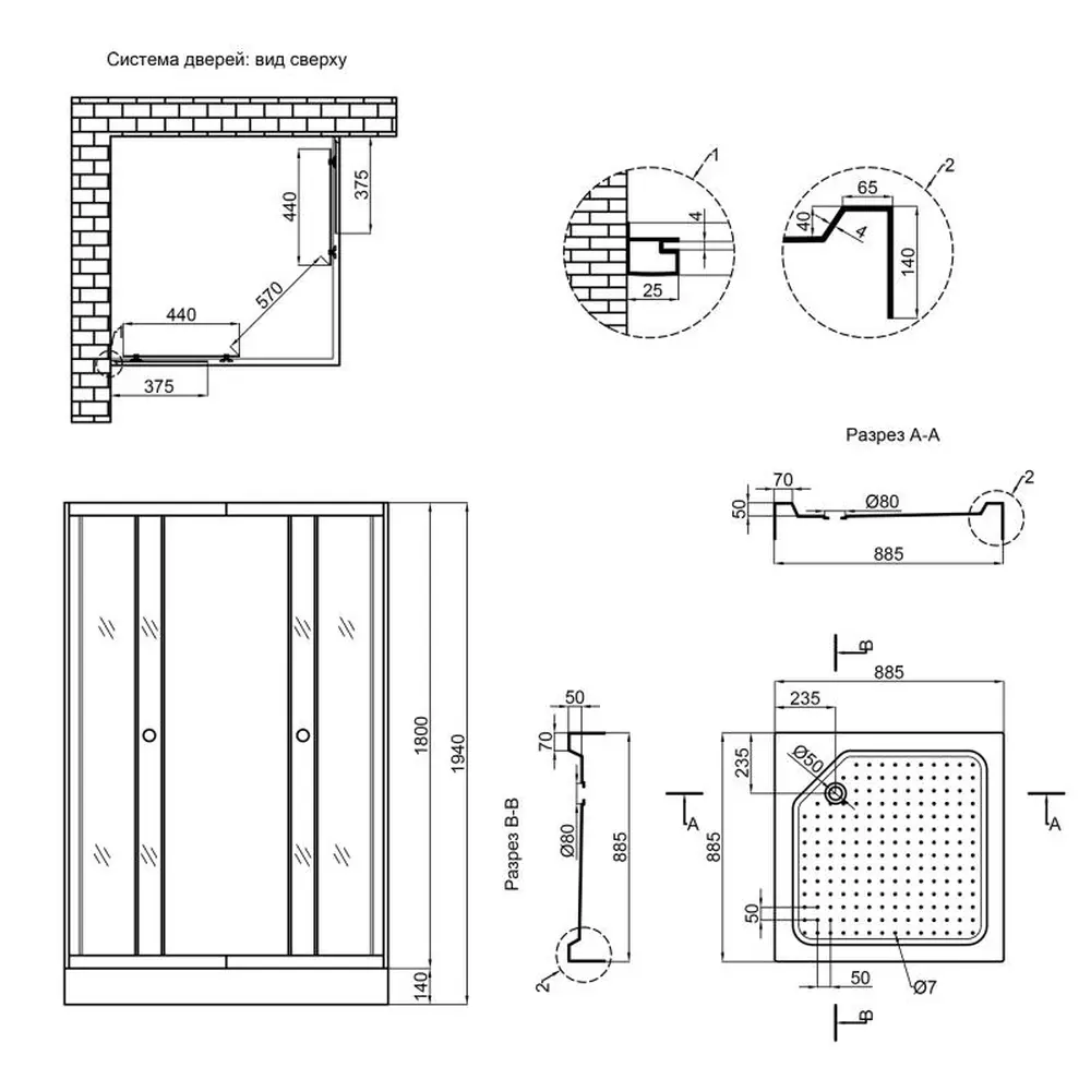 Піддон, сифон, подвійні ролики, ручки, комплект кріпильних деталей, глухе скло, скляні двері, перехідник 32/50 мм, профіль, з‘єднуючий елемент.