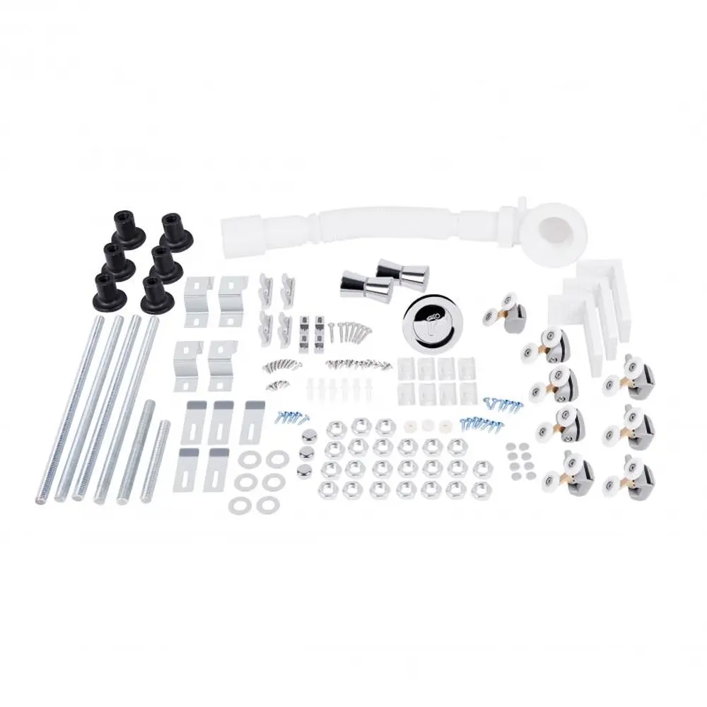 Піддон, сифон, подвійні ролики, ручки, комплект кріпильних деталей, глухе скло, скляні двері, перехідник 32/50 мм, профіль.