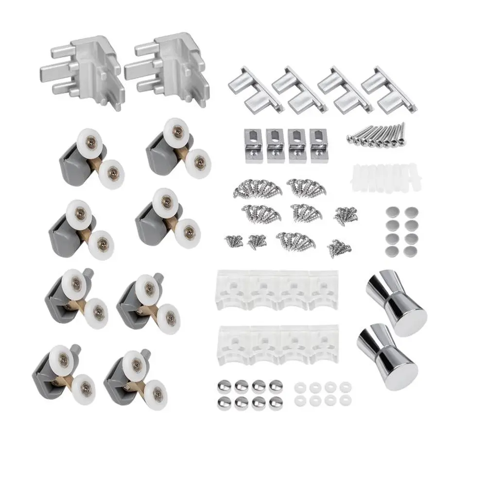 Подвійні ролики, ручки, комплект кріпильних деталей, глухе скло, скляні двері, профіль, з‘єднуючий елемент.