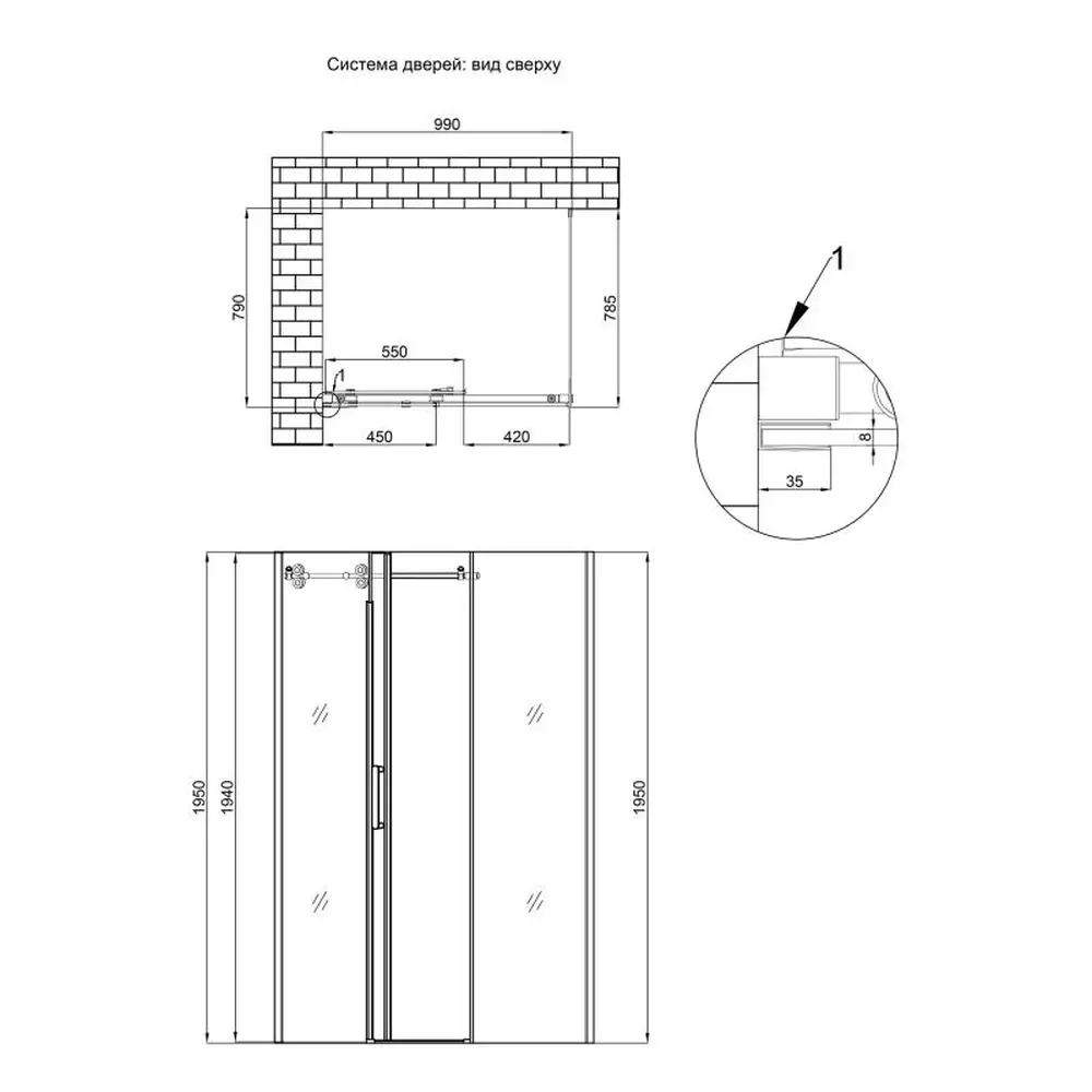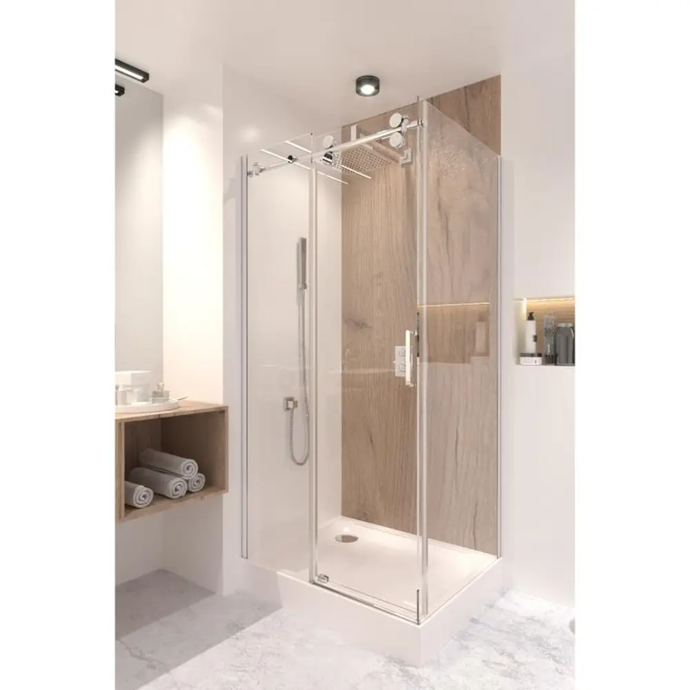 Верхній профіль, металеві ролики, бічна панель, глухе скло, скляні двері, нижній борт, комплект кріплень, ручка, набір ущільнювачів, заглушки.